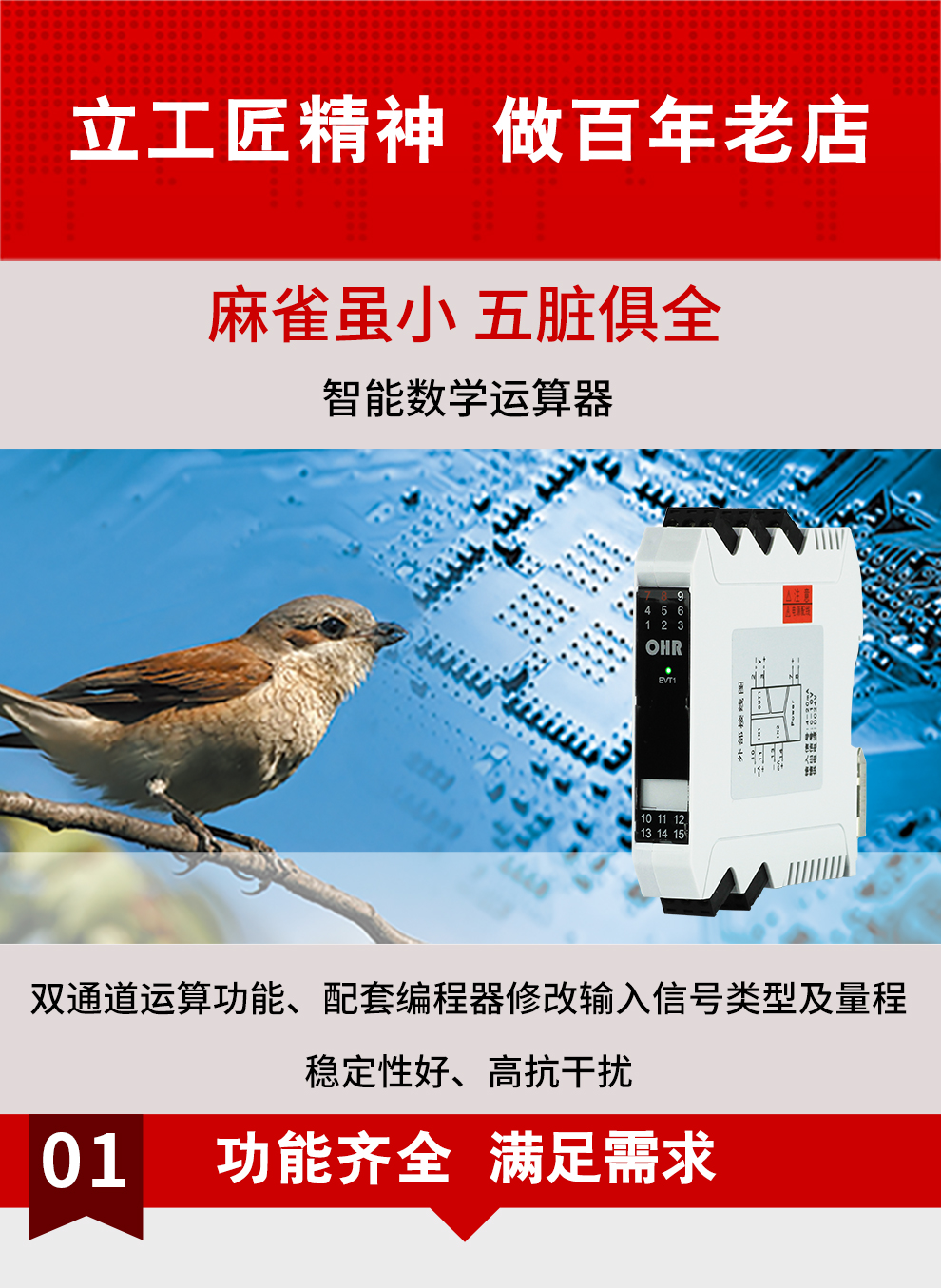虹潤公司是專業(yè)生產運算器的國家專精特新“小巨人”企業(yè),生產的智能數學運算器,具有全切換信號輸入,加減乘除數學運算,穩(wěn)定性好,高抗干擾,RS485/RS232通訊等特點。產品獲得巡回檢測顯示方法及裝置、儀表殼體等2項國家發(fā)明專利,主持起草工業(yè)過程控制系統(tǒng)用模擬輸入兩位或多位輸出儀表、物聯(lián)網智能溫度儀表通用技術條件等2項國家標準,,以及通信系統(tǒng)多通道數據采集控制終端規(guī)范軍用標準,參與國際5G標準制定,取得雙回路數字顯示控制儀表等3項相關軟件著作權。產品廣泛應用于電力、石化、冶金、化工、造紙、食品、輕工、制藥、熱處理、水處理、機械配套等各種工業(yè)現場。
