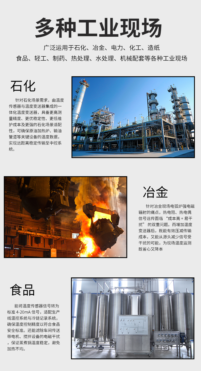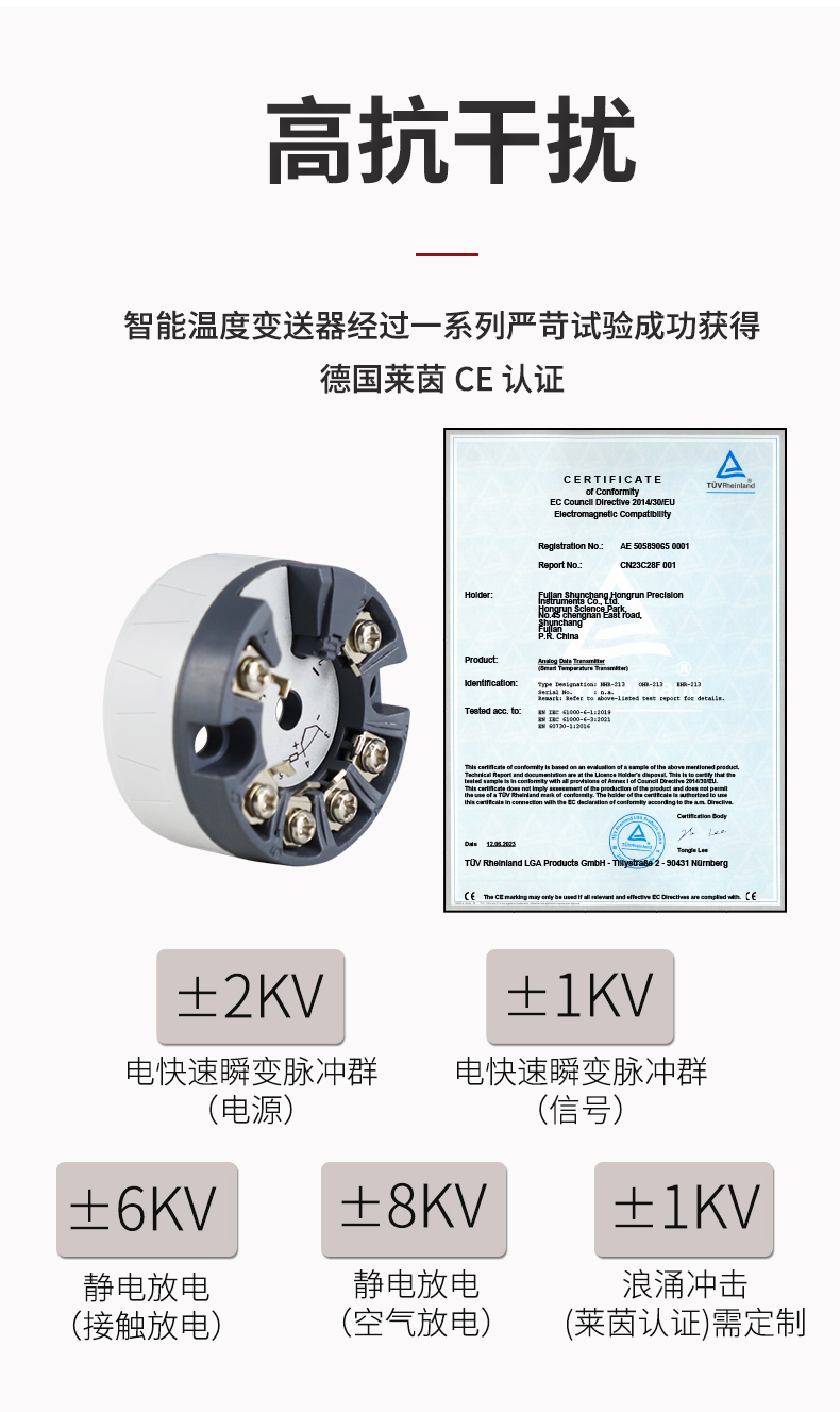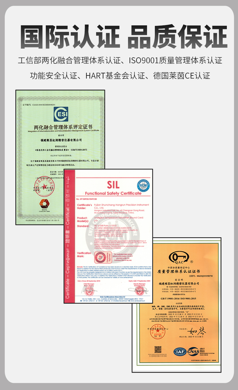 虹潤(rùn)公司是專業(yè)生產(chǎn)溫度變送器的國(guó)家專精特新“小巨人”企業(yè)。生產(chǎn)的智能溫度變送器,具有適配各類溫度傳感器,精度高,穩(wěn)定性好,通過(guò)編程線修改輸入信號(hào)類型及量程,高抗干擾等特點(diǎn)。該產(chǎn)品不僅通過(guò)HART基金會(huì)認(rèn)證、德國(guó)萊茵 CE 認(rèn)證與 SIL 功能安全認(rèn)證,還獲得具備減震抗干擾能力的溫度變送器、信號(hào)隔離器、一種二端子模塊、無(wú)源信號(hào)隔離器等4項(xiàng)國(guó)家發(fā)明專利,主持起草物聯(lián)網(wǎng)智能溫度儀表、現(xiàn)場(chǎng)設(shè)備工具(FDT)接口規(guī)范、工業(yè)過(guò)程測(cè)量和控制系統(tǒng)用溫度變送器等3項(xiàng)國(guó)家標(biāo)準(zhǔn),以及通信系統(tǒng)多通道數(shù)據(jù)采集控制終端規(guī)范軍用標(biāo)準(zhǔn),參與國(guó)際5G標(biāo)準(zhǔn)制定,取得智能溫度變送器、HART溫度變送器等3項(xiàng)相關(guān)軟件著作權(quán)。產(chǎn)品廣泛應(yīng)用于石油、化工、電力、冶金、制藥、食品、水處理等各種工業(yè)領(lǐng)域。