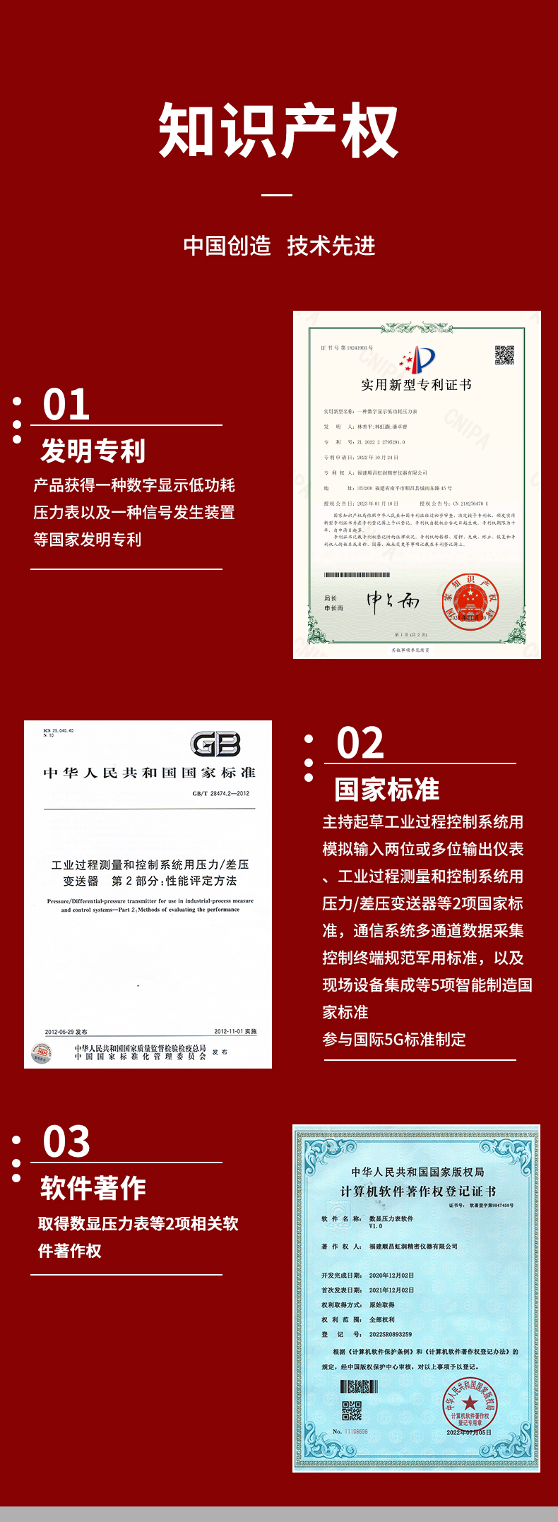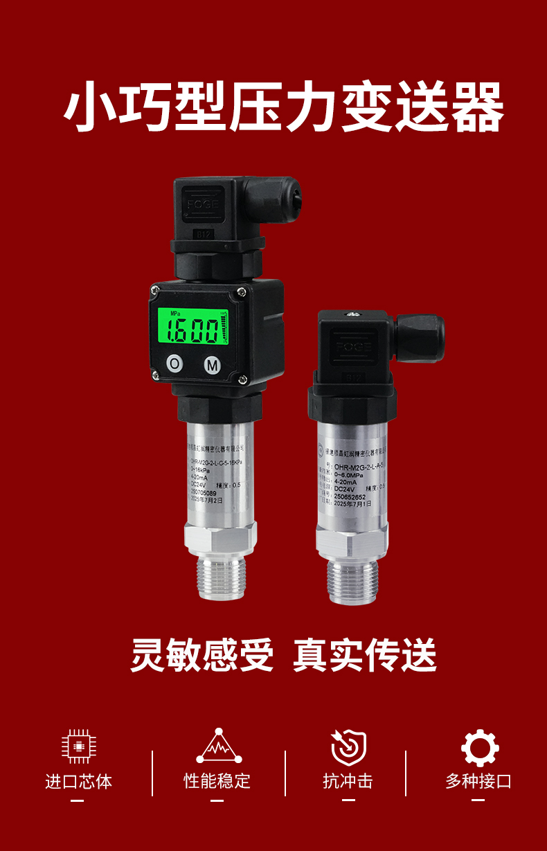 虹潤公司是專業(yè)生產(chǎn)壓力變送器的國家專精特新“小巨人”企業(yè),生產(chǎn)的小巧型壓力變送器,具有采用進口芯體,量程范圍寬,抗沖擊抗震動,多種螺紋接口,性能穩(wěn)定等特點。產(chǎn)品獲得一種數(shù)字顯示低功耗壓力表、一種信號發(fā)生器裝置等2項國家發(fā)明專利,主持起草工業(yè)過程控制系統(tǒng)用模擬輸入兩位或多位輸出儀表、工業(yè)過程測量和控制系統(tǒng)用壓力/差壓變送器等2項國家標準,通信系統(tǒng)多通道數(shù)據(jù)采集控制終端規(guī)范軍用標準,以及現(xiàn)場設(shè)備集成等5項智能制造國家標準,參與國際5G標準制定,取得數(shù)顯壓力表等2項相關(guān)軟件著作權(quán)。產(chǎn)品廣泛應(yīng)用于化工、食品、制藥、電力、設(shè)備配套、供暖、水處理、樓宇等行業(yè),需精準測量流體壓力的現(xiàn)場。