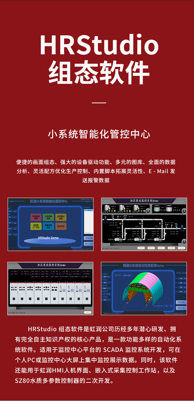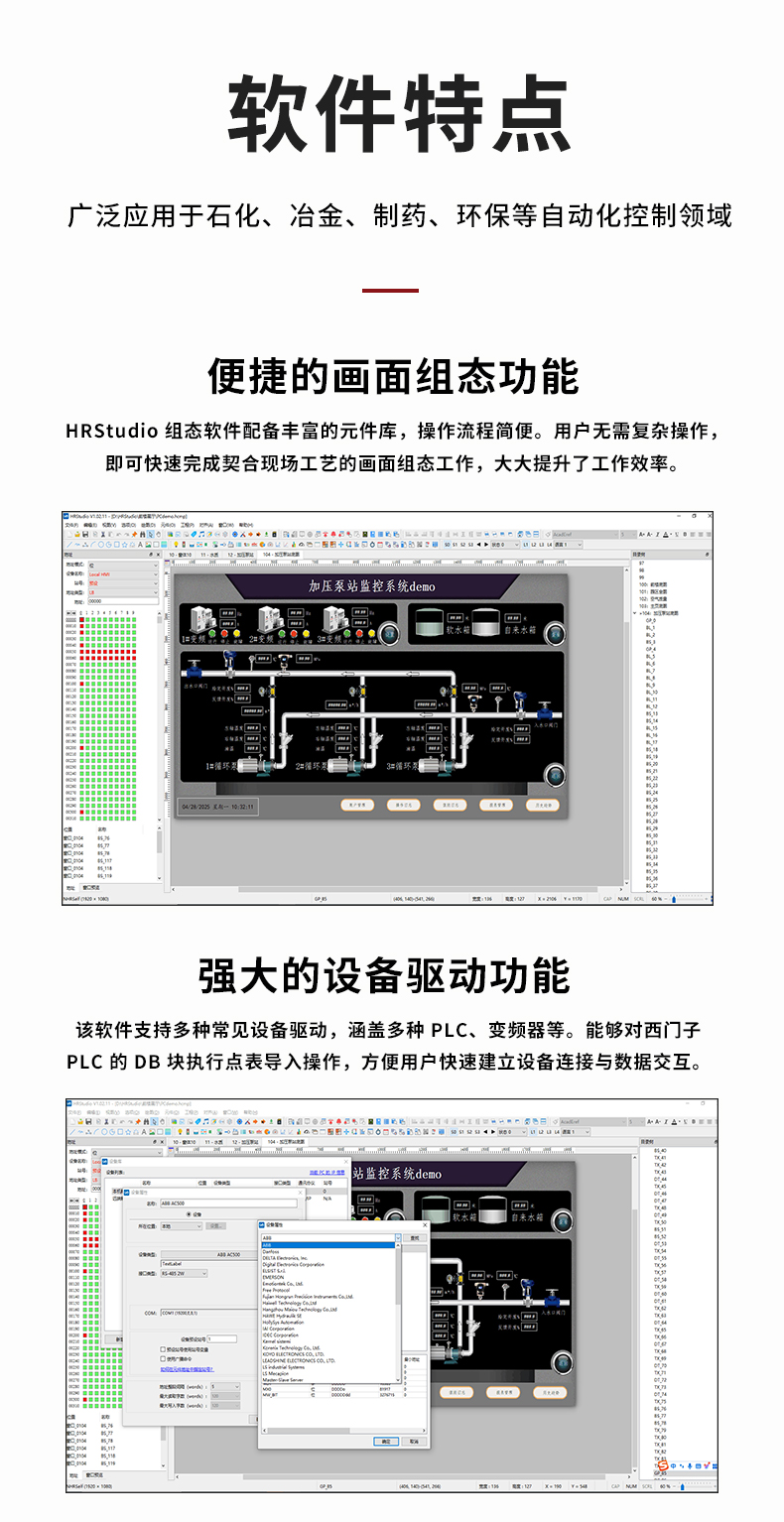 虹潤公司是專業(yè)研發(fā)組態(tài)軟件的國家專精特新“小巨人”企業(yè)。開發(fā)的HRStudio組態(tài)軟件,具有便捷組態(tài)畫面,強(qiáng)大設(shè)備驅(qū)動,多元化的圖庫,數(shù)據(jù)庫操作,內(nèi)置腳本拓展,權(quán)限管理數(shù)據(jù)備份等特點。產(chǎn)品獲得嵌入式數(shù)據(jù)采集工作站組網(wǎng)系統(tǒng)等1項國家發(fā)明專利,主持起草通信系統(tǒng)多通道數(shù)據(jù)采集控制終端規(guī)范軍用標(biāo)準(zhǔn),空間數(shù)據(jù)與信息數(shù)據(jù)傳輸系統(tǒng)等2項航天標(biāo)準(zhǔn),以及現(xiàn)場設(shè)備集成等5項智能制造國家標(biāo)準(zhǔn)。參與國際5G標(biāo)準(zhǔn)制定,取得HRStudio 畫面組態(tài) 等1項相關(guān)軟件著作權(quán)。產(chǎn)品廣泛應(yīng)用于冶金、石化、制藥、設(shè)備配套、環(huán)境監(jiān)測、農(nóng)業(yè)、生產(chǎn)過程控制等諸多領(lǐng)域。